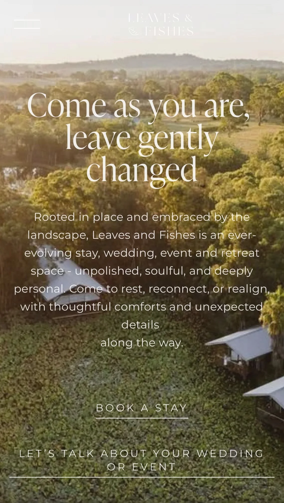Rooted in place and embraced by the landscape, Leaves and Fishes is an ever-evolving stay, wedding, event and retreat space - unpolished, soulful, and deeply personal. Come to rest, reconnect, or realign, with thoughtful comforts and unexpected details